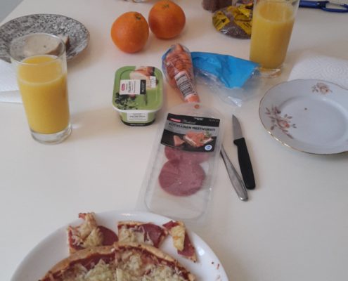 Als ich frühs aus dem Fenster unseres Apartments schaute, wusste ich, dass es ein guter Tag wird. Der Himmel war fast gänzlich blau und die Sonne schien. Nach einem ausgewogenen Frühstück (süßes Hefebrot, Pizza vom gestrigen Abend und Blutorangen), packten wir, meine Bekannte Ella und ich, unsere Koffer und verließen die Wohnung. Mit dem Bus ging es ins Zentrum von Turku. Dort sonnten wir uns dann eine Weile auf einer Bank direkt am Flussufer. Da es schon Mittag war, aßen wir Burritos und Nachos in einem mexikanischen Restaurant, welches wir am Tag zuvor entdeckt hatten. Mit dem Onnibus ging es dann wieder zurück nach Helsinki. Die gesamten Fahrt über konnten wir die Landschaft Finnlands bewundern. Die goldene Sonne gab den Wäldern, Felsen und Seen einen ganz besonderen Glanz. Bis unsere Anschlusszüge kamen und es Abschied nehmen hieß, spielten wir in Oodi noch einige Runden Skip-Bo.