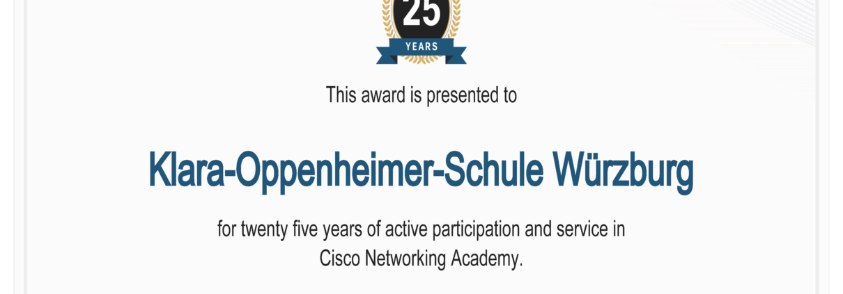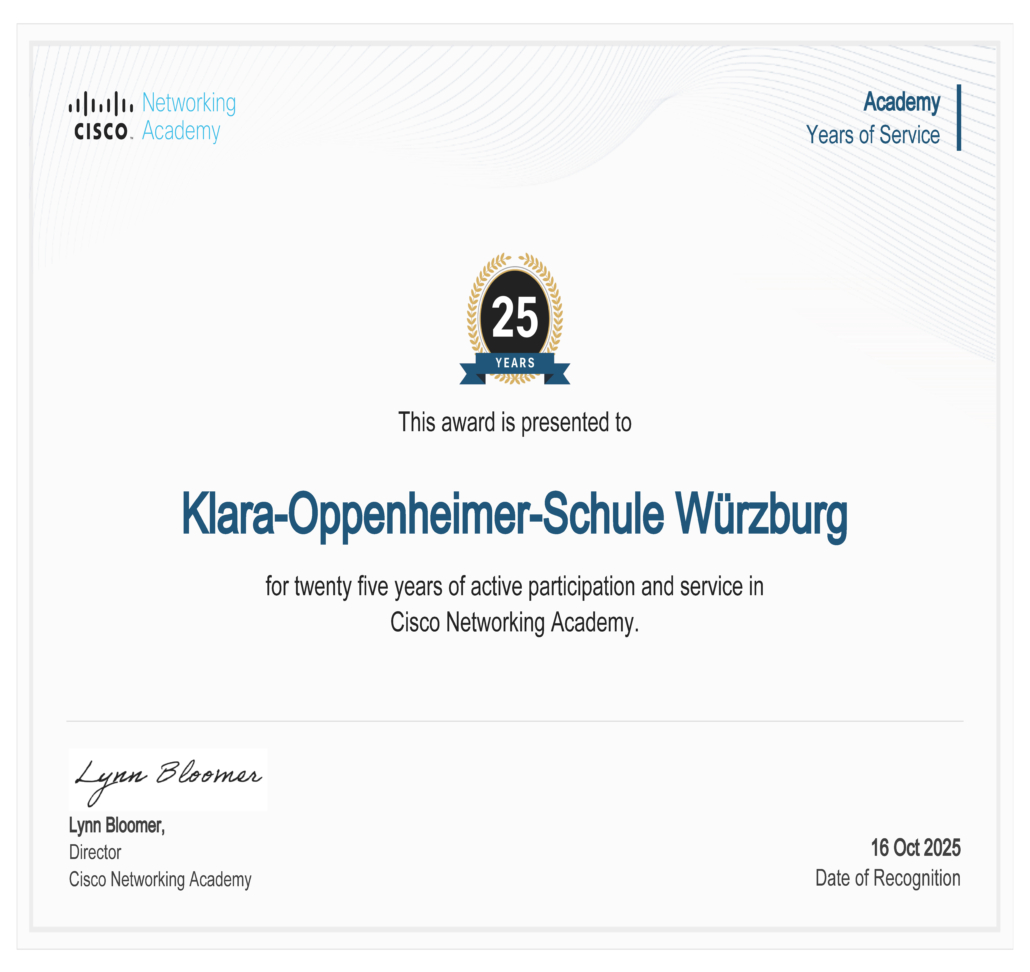 Am 16. Oktober 2025 wurde unsere Schule für ihre 25-jährige Teilnahme am internationalen Cisco-Networking-Academy-Programm ausgezeichnet. Diese Ehrung würdigt ein Vierteljahrhundert Engagement für digitale Bildung und den nachhaltigen Aufbau von IT-Kompetenzen bei unseren Schülerinnen und Schülern. Ins Leben gerufen wurde die Cisco Academy an unserer Schule im Jahr 2000 von einer Lehrkraft im Fachbereich IT, der damit frühzeitig den Grundstein für eine zukunftsorientierte Ausbildung im Bereich Netzwerktechnik legte. Seither ist unsere Schule Teil eines weltweiten Bildungsnetzwerks, das jungen Menschen praxisnahe IT-Kenntnisse vermittelt.