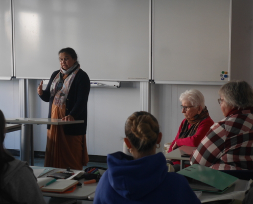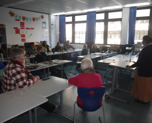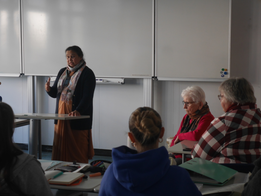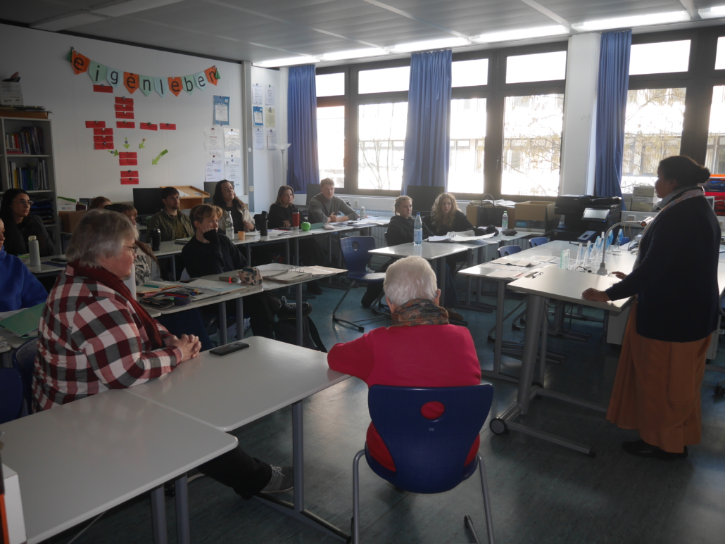 Weit gereister Besuch war heute an unserer Schule: Schwester Jema, Leiterin des Mädcheninternats „Girls Hostel“ in Pathardi/Indien. Dort wird Töchtern indischer Wanderarbeiterinnen und Wanderarbeiter die Möglichkeit zu einer qualifizierten Schul- und Berufsausbildung gegeben.