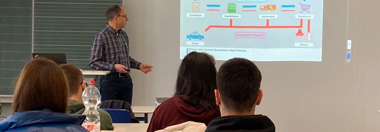 Im Februar 2026 waren zwei Mitarbeiter der Deutschen Bundesbank im Fachbereich Einzelhandel zu einer Vortragsreihe zum Thema Falschgeld zur Gast. Sie informierten Azubis in den Berufen Verkauf und Einzelhandel mit Hilfe vieler Statistiken über die aktuelle Lage zum Zahlungsverkehr mit Bargeld:
