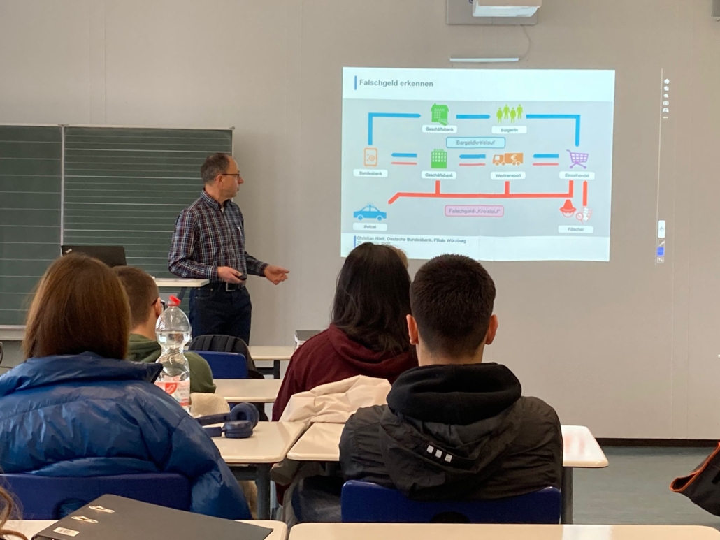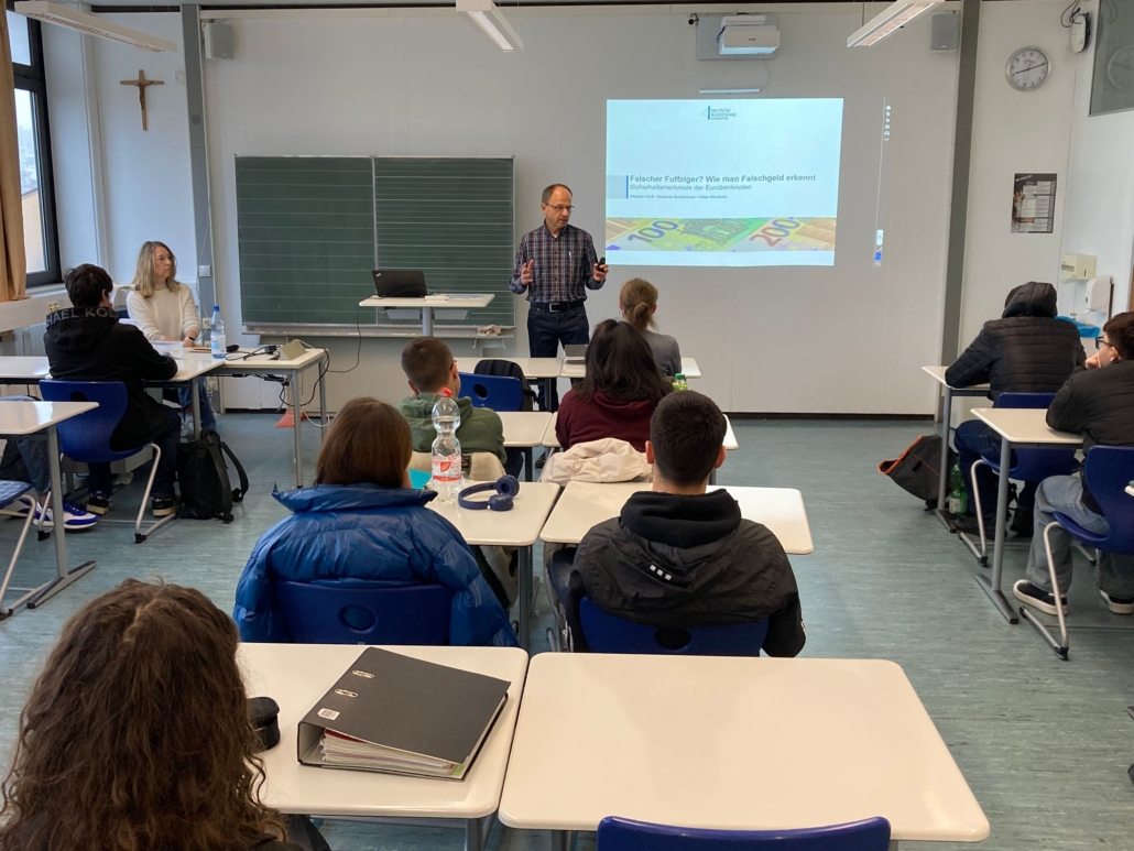 Im Februar 2026 waren zwei Mitarbeiter der Deutschen Bundesbank im Fachbereich Einzelhandel zu einer Vortragsreihe zum Thema Falschgeld zur Gast. Sie informierten Azubis in den Berufen Verkauf und Einzelhandel mit Hilfe vieler Statistiken über die aktuelle Lage zum Zahlungsverkehr mit Bargeld: