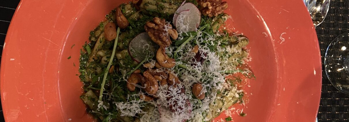In der Zwischenzeit gab es natürlich auch Mittagessen, was hier ein totaler Hit war! Es war nämlich keine Kantine oder ähnliches, sondern wie ein richtiges Restaurant in einer Schule. Hier werden nämlich nicht nur kaufmännische und technische Berufe ausgebildet, sondern auch Köche/Köchinnen, Kellner:innen oder vieles mehr. Man wurde also von einem Kellner-Azubi in das “Restaurant” und zu seinem Tisch geführt. Danach klärte er einen über die Allergene des heutigen Essens auf und fragte nach unseren Ernährungsweisen. Für mich gab es deshalb eine Pasta mit einem Bärlauch Pesto und gerösteten Nüssen obendrauf. Es hat wahnsinnig lecker geschmeckt! Lange saß ich aber nicht vor meinem schnell geleerten Teller… der Nachtisch ließ nicht lange auf sich warten: eine sogenannte “Rocca-socca-mousse“. Niemand wusste genau, was es war, trotzdem waren wir uns alle einig, dass es super geschmeckt hat! Man kann sich kaum vorstellen, dass das alles alltäglich für die Schüler:innen hier ist. Und dann auch noch kostenlos und ohne irgendeine Sonderleistung zu erbringen. Es reicht die Tatsache, Schüler:in an dieser Schule zu sein!